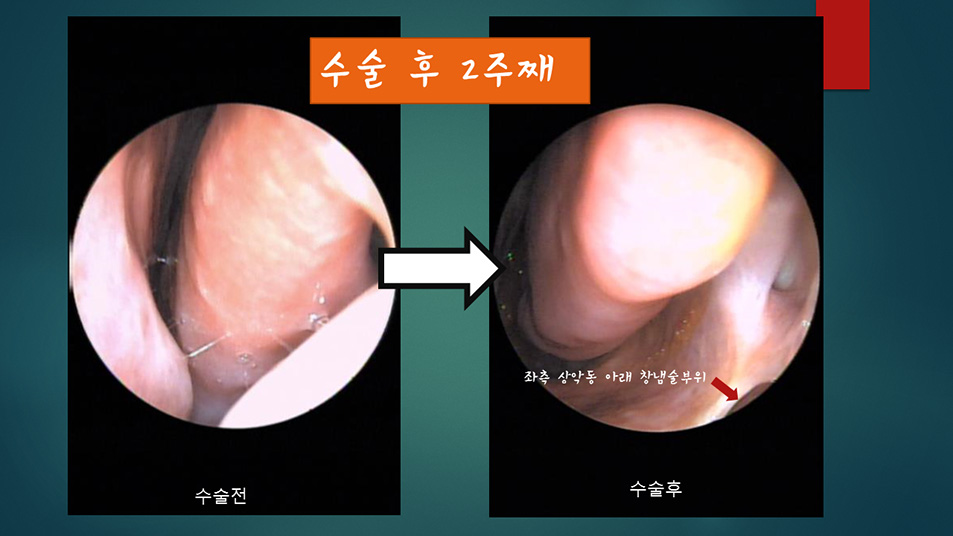 아래 코선반의 크기가 상당히 줄었고 이전에는 비염때문에 막혀있던 상악동 아래창이 아주 잘 관찰이 됩니다. 수술 후 환자분은 현재 불편한 증상 없이 잘 회복 중입니다. 감사합니다.^^ 수술한지 2주가 채 되지 않았지만 좌측 마이트 수술부위는 딱지하나 없군요. 역쉬!~