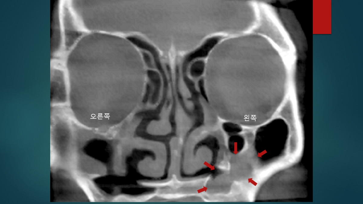 좌측 상악동의 아래쪽(화살표가 가리키는 부분)으로 뿌연 연조직 음영이 관찰됩니다. 과거 상악동 수술부위의 재발 소견입니다. 내시경으로 봤을때는 지난 축농증 수술시 만들어진 좌측 상악동 아래창 부위를 아래 코선반의 점막이 완전히 막고 있었습니다.